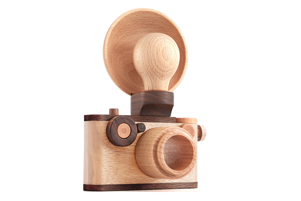 Inspire imaginative play with this wooden toy camera, a vintage-inspired 35mm design handcrafted from solid beech and walnut wood. With a clickable shutter, kaleidoscope lens, and detachable wooden flash reflector, it encourages imaginative and pretend play while developing fine motor skills.